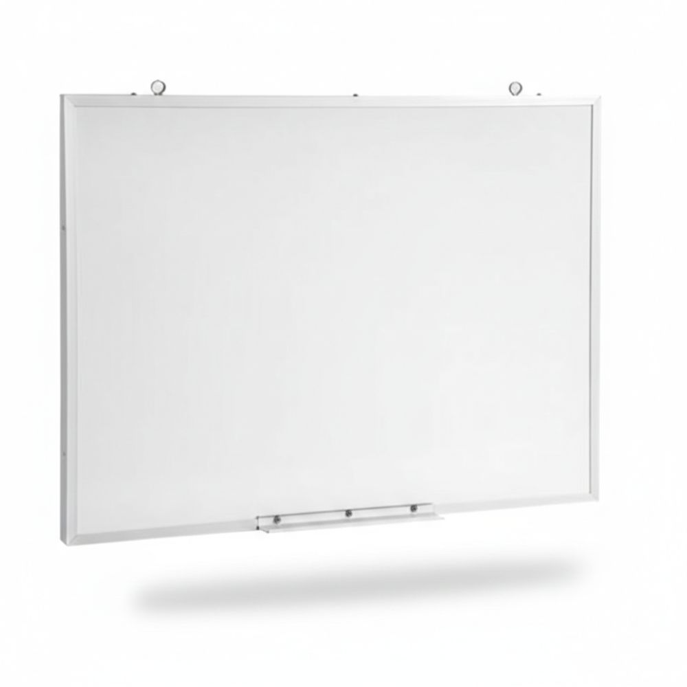 Pizarra acrílica blanca de 80x60cm, con marco de aluminio, superficie lisa con ligeros cuadros y soporte para plumón y mota. Ideal para oficinas, aulas, negocios o uso en casa.