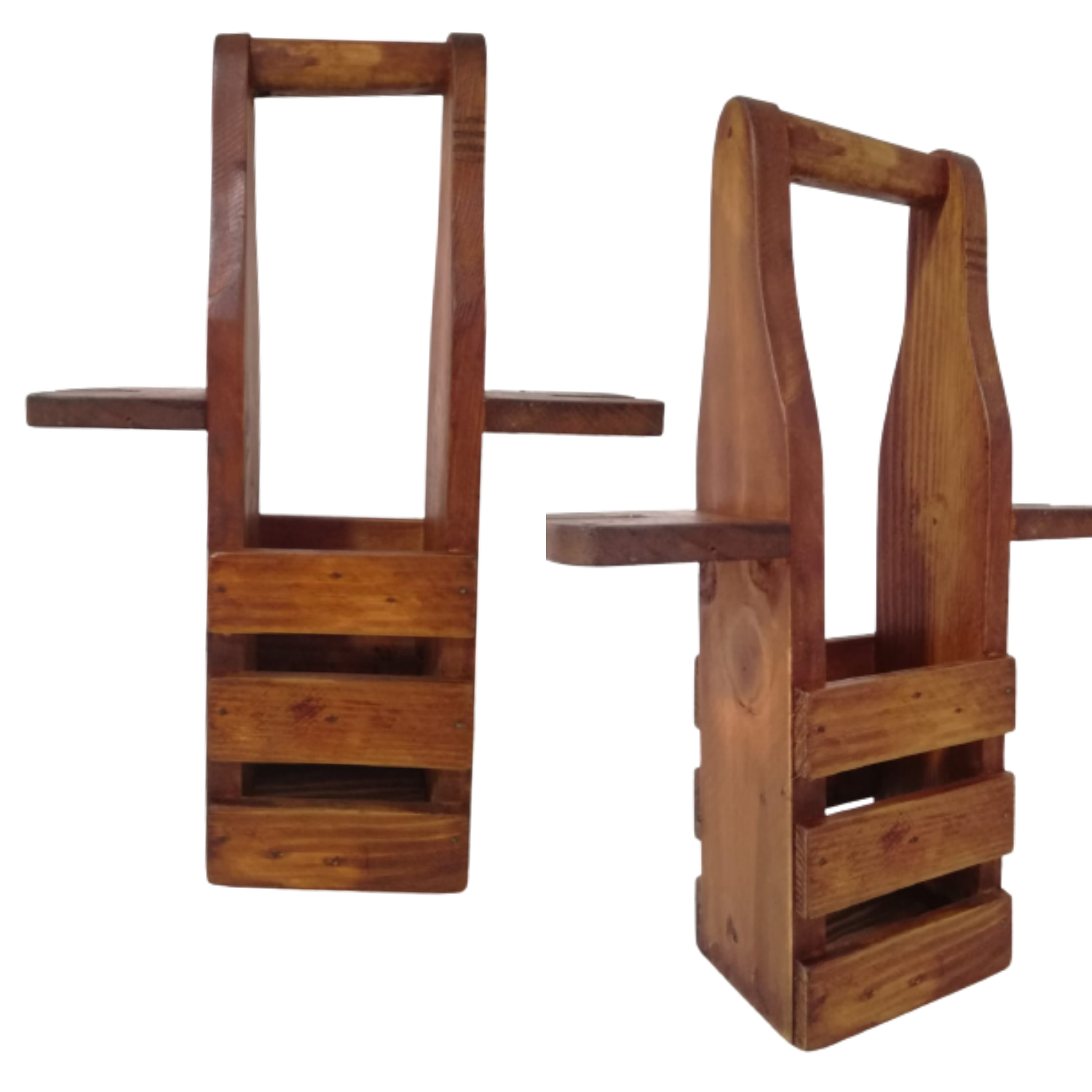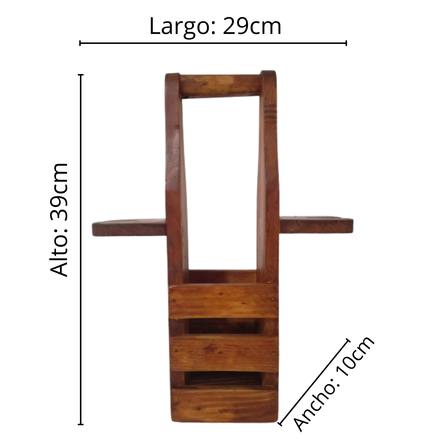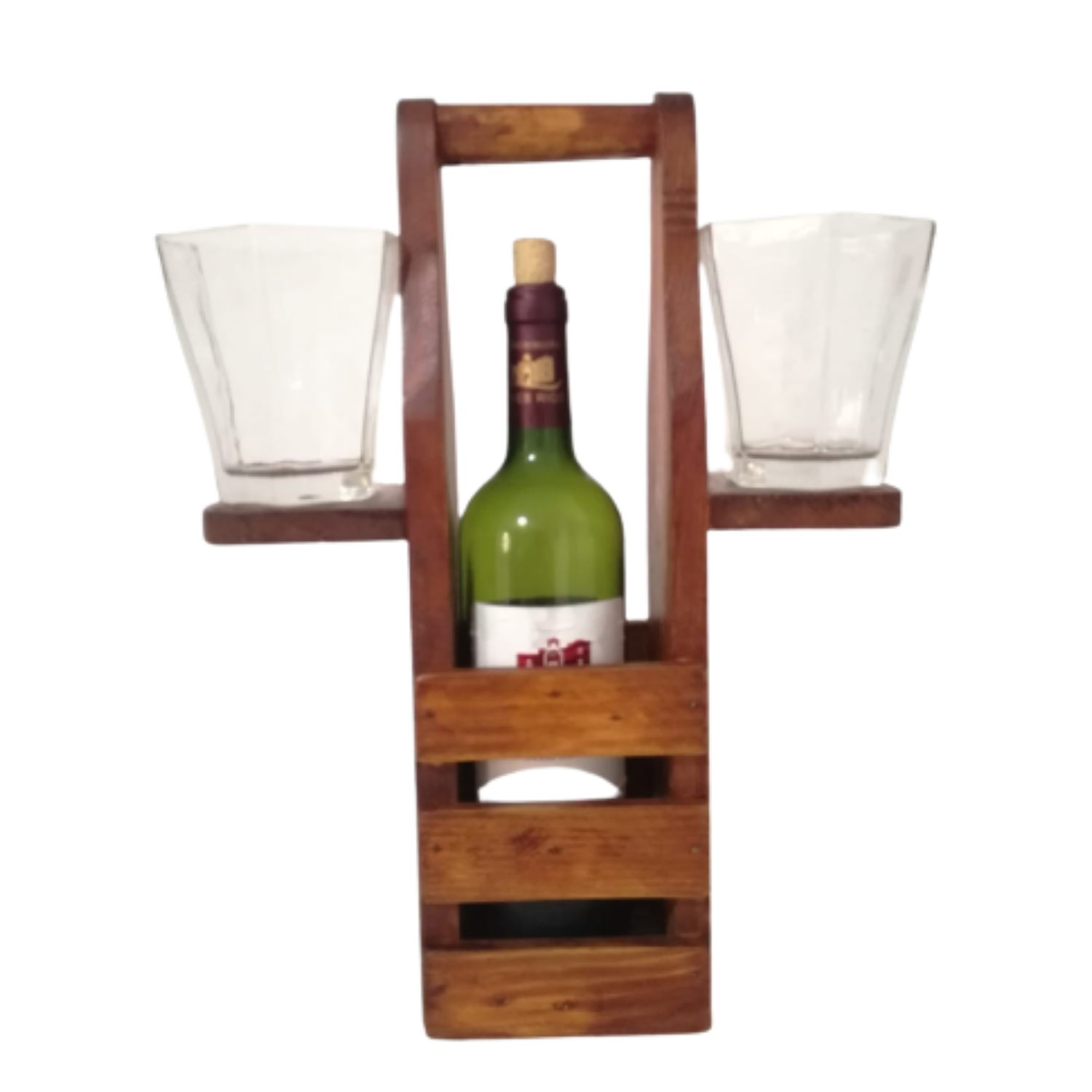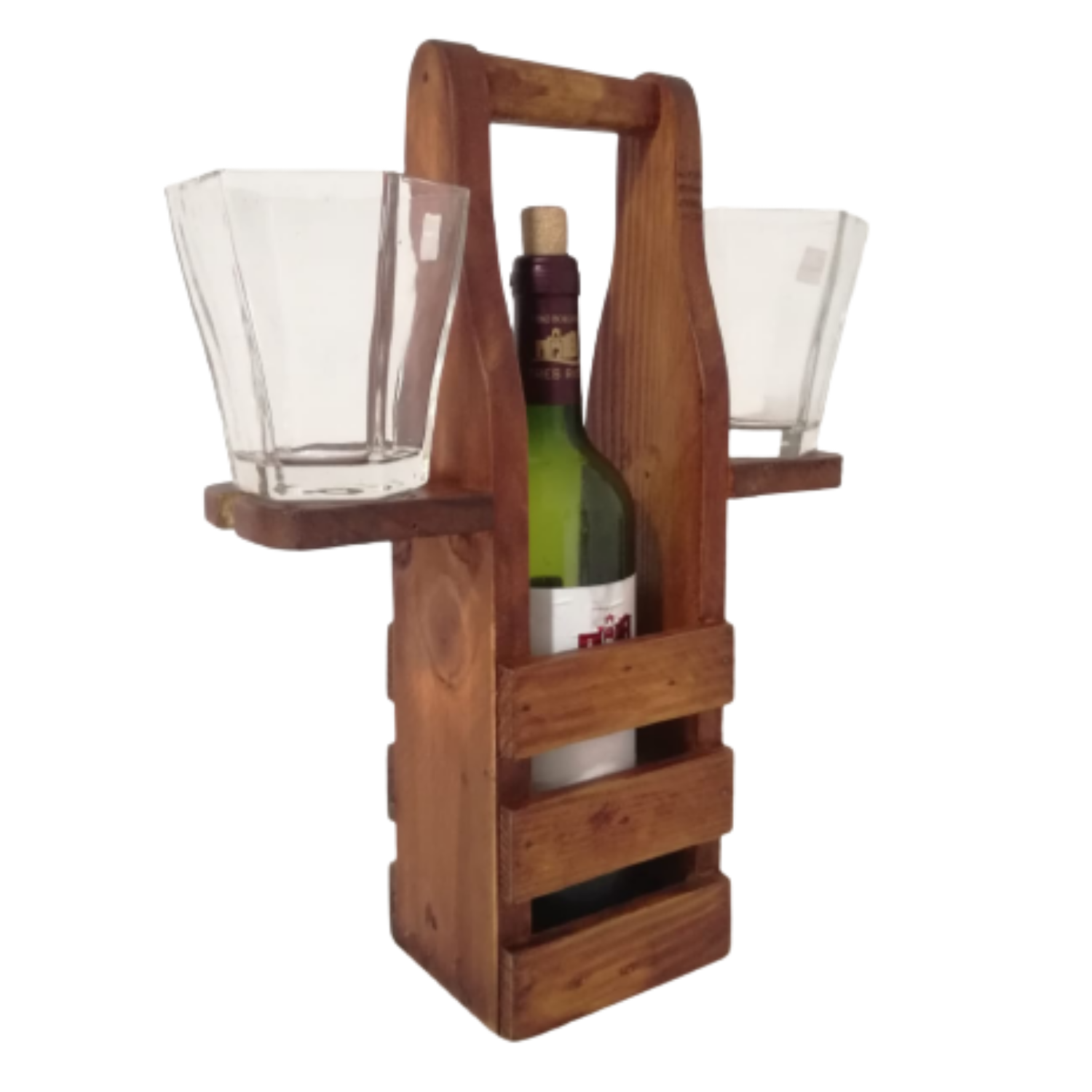 Porta vino playero portatil, fabricado en madera, con espacio para colocar la compa o vasos, y el vino u otro trago.