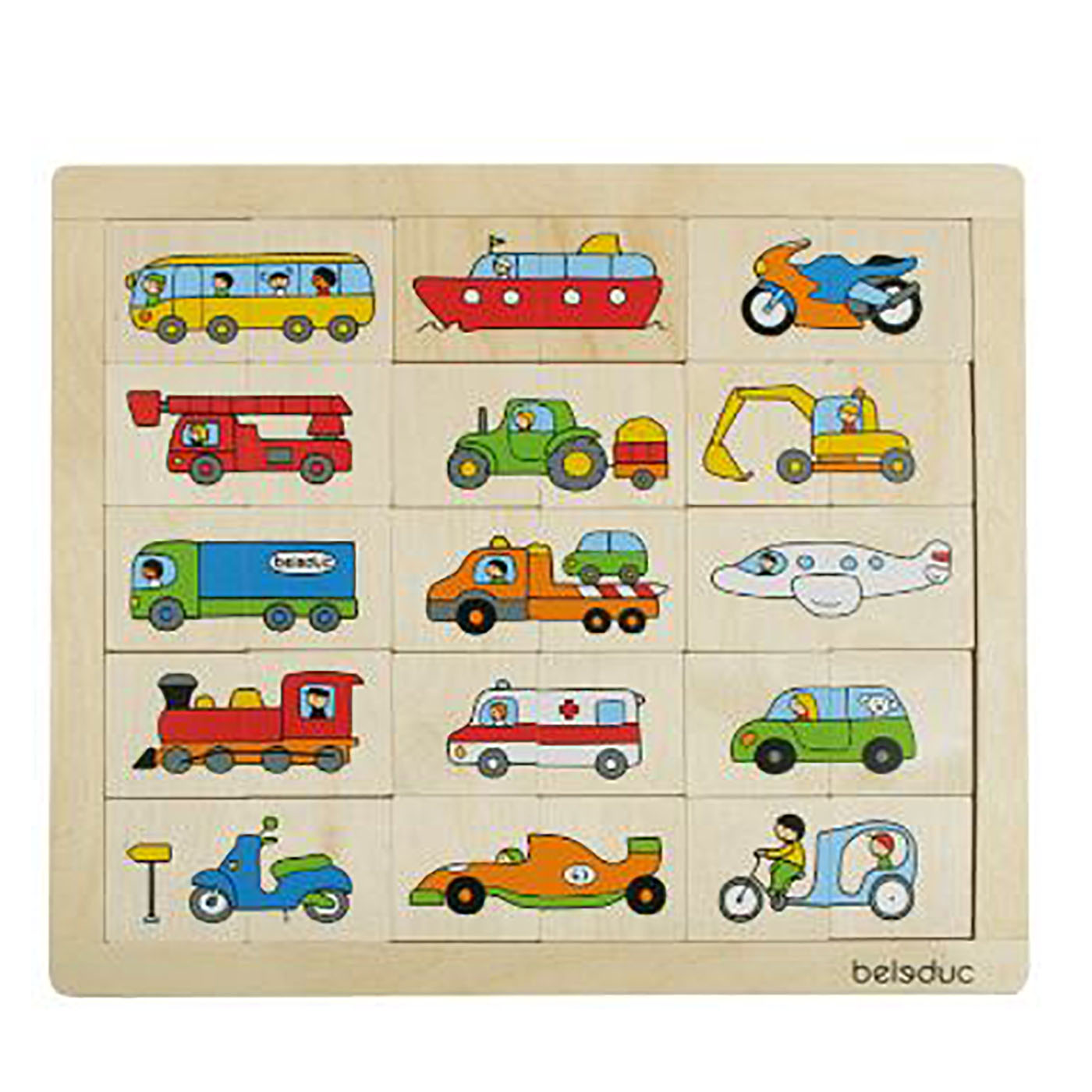 Puzle asociación medios de transporte, contiene 30 piezas, 2 de ellas corresponden a la imagen de un medio de transporte. (Autobus, locomotora, grúa, tractor, retroexcavadora, camión, para transportar autos, avión, locomotora, ambulancia, auto, motoneta, auto de carrera, bicicleta). Crea secuencias lógicas. Material madera. Sus dimensiones son 34 x 29 x 1 cm. (Base) y 5 x 5 cm. (Cada pieza).
